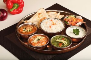 Butter chicken, chicken nuggets, pommes frites, papad, basmati rice and mango cream