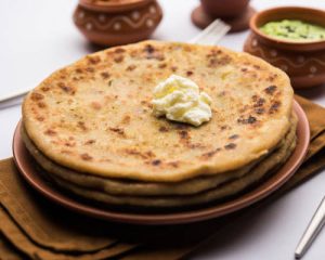 Vollkornbrot gefüllt mit Kartoffel, Zwiebeln, Koriander und grüner Chili