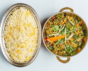 Indisches Okra-Gemüse mit Ingwer, Knoblauch, Koriander in kräftiger Masala-Sauce