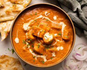 Hausgemachter Käse (aus Kuhmilch) mit gemahlenen Cashewnüssen in Buttercreme-Tomatensoße