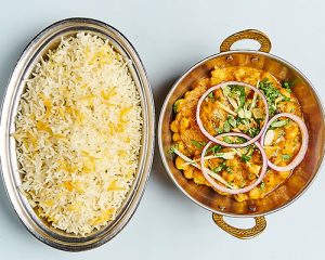 (ayurvedisch) Kichererbsen in Ingwer, Knoblauch, Koriander und würziger Currysauce