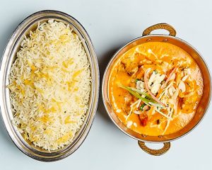 Hühnerbruststücke in Joghurt, gemahlene Cashewnüsse, Mandel-Sahne-Sauce und exotischen Gewürzen (Mild)