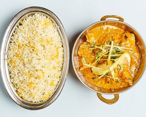 Hühnerbruststücke in Joghurt, gemahlene Cashewnüsse, Mandel-Sahne-Sauce und exotischen Gewürzen (Mild)