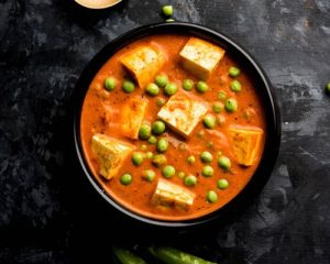 (ayurvedisch) Grüne Erbsen und hausgemachter Käse (aus Kuhmilch) mit gemahlenen Cashewnüsse in einer Curry-Creme-soße