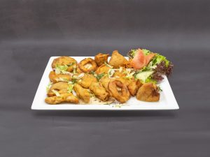 Gaumenfreude zu zweit: Verschiedene gemischte Gemüse, Veg. Samosa, Hühnerfilet, Fisch in Kichererbsenmehl gewendet und frittiert
